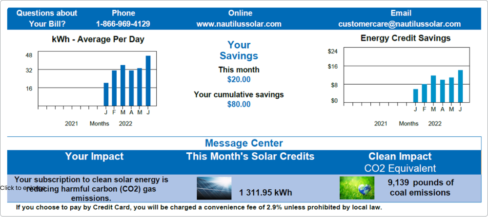 In the Two-Bill format, you’ll see the bill from Nautilus Solar once we receive the solar credit data from your utility company. This could take up to three months.